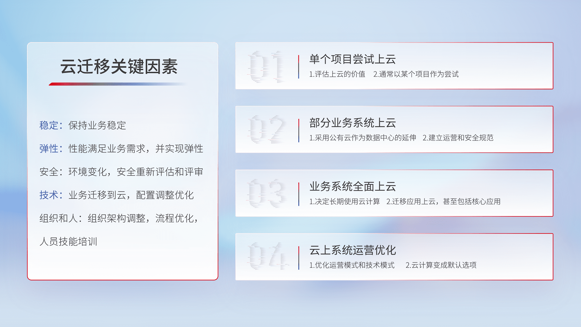 结合实际业务,,从规划设计、、、、云平台选型、、、、云原生改造、、数据迁移、、集成交付,,,,迁移全过程为客户识别最佳上云路径,,做好风险识别管理,,设计网络架构、、身份权限、、、安全审计合规、、、操作审计、、日志审计、、监控告警策略、、、、多站点容灾设计等,,对云上基础设施进行整体规划,,,提升IT治理水平,,以满足弹性、、、、高可用、、、、高性能的需求。。。